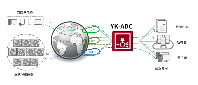 尊龙时凯通明湖应用交付控制器提供链路负载均衡技术(LLB)和全局负载均衡技术(GSLB)分别实现出向流量(Outbound)和入向流量(Inbound)的统一管理。
